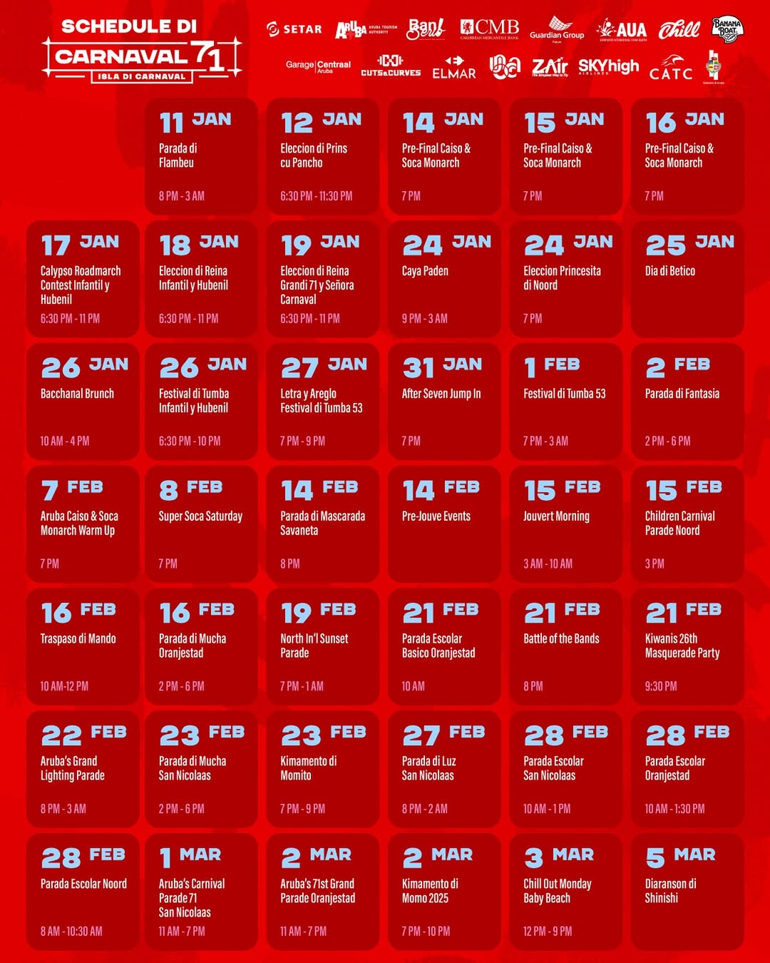 For more information about Aruba’s Carnival go the official SMAC page. The official organizing body of Aruba’s Carnival.